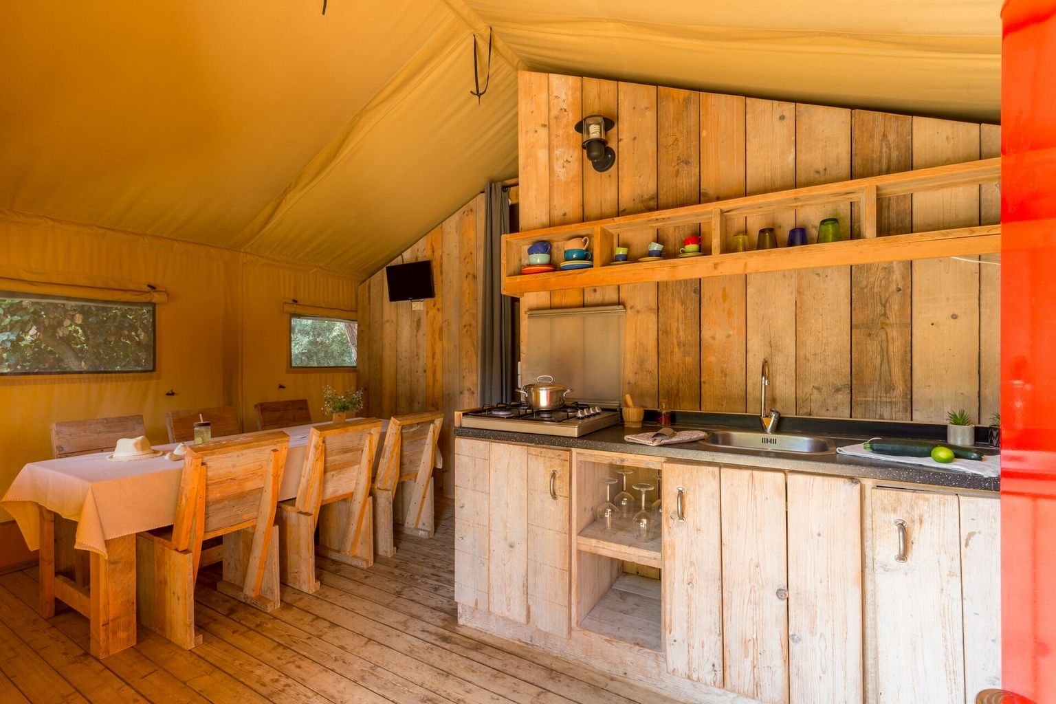 Tavolo e sedie, Stoviglie, Utensili per la cucina, Bollitore, Lavello, Caffettiera elettrica, 4 fuochi a gas, Microonde, Frigorifero